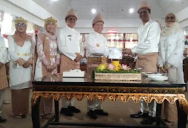 Dipenghujung rangkaian Rapat Paripurna ke VIII HUT ke 21 Kabupaten Ogan Ilir, dilanjutkan dengan pemotongan tumpeng yang dilakukan oleh Ketua DPRD Ogan Ilir diserahkan kepada Pj Gubernur Sumsel dan foto bersama. (RC/ ADV/ EMI)