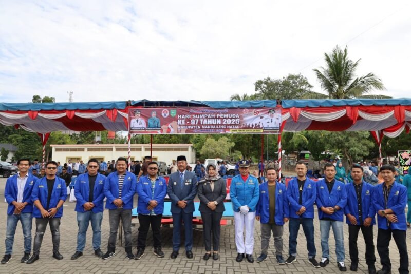 RADARCenter, Mandailing Natal– Tim karateker DPD II Komite Nasional Pemuda Indonesia (KNPI) kabupaten Mandailing Natal menghadiri upacara peringatan hari Sumpah Pemuda ke-97 tingkat kabupaten Mandailing Natal, dihalaman Mesjid Agung Nur alannur, pada Selasa (28/10/2025).