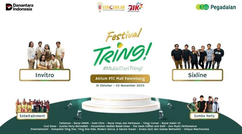 RADARCenter,Palembang– PT Pegadaian sambut meriah kehadiran aplikasi terbarunya Tring! by Pegadaian, dengan menggelar Festival Tring! di Kota Palembang PTC Mall Festival akbar di Sumatera Selatan akan berlangsung dari 31 Oktober hingga 02 November 2025, yang menjadi ajang perkenalan dan penanda resminya kehadiran aplikasi tersebut di tengah masyarakat SumBagSel.