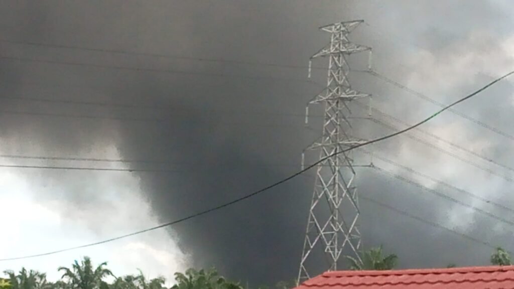 Sesaat kemudian, terdengar suara ledakan keras yang diikuti kobaran api besar. Asap hitam pekat membumbung tinggi dan membuat warga sekitar panik berhamburan keluar rumah.
