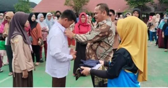 Tampak dilokasi, Kepala Sekolah SMP N 12 Palembang Suparman Sunaryo, S.Pd., M.Pd menyerahkan langsung bantuan seragam sekolah tersebut kepada siswa-siswi.
