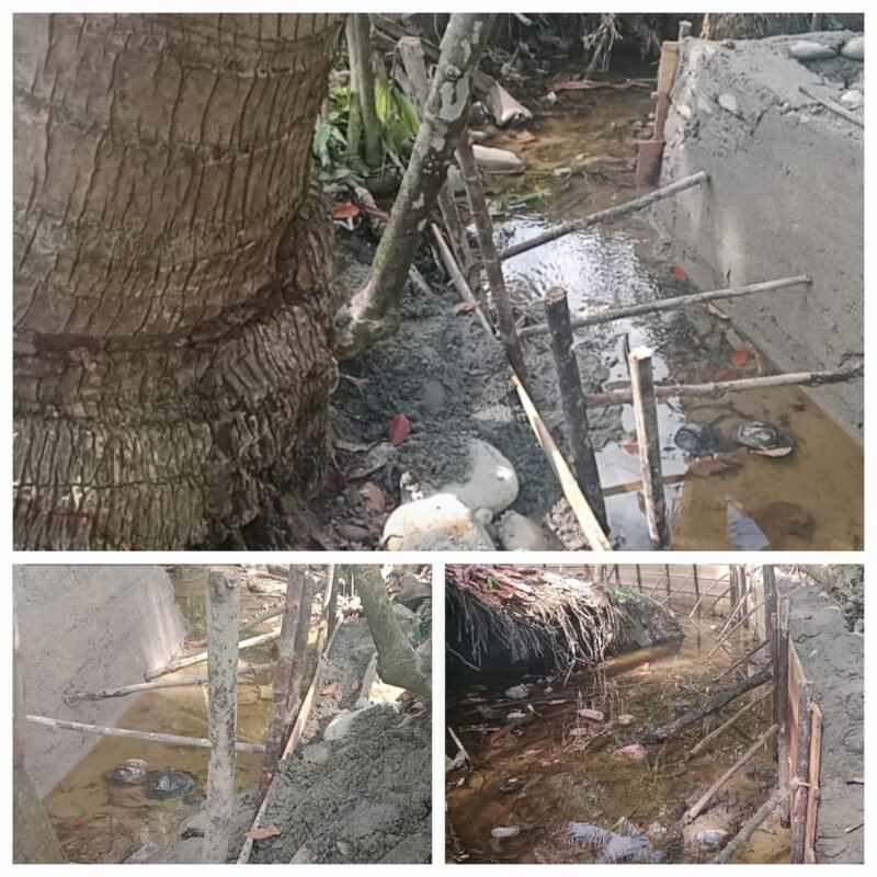 Dari pantauan di lokasi pada Rabu (05/11/2025) sekitar pukul 14.53 WIB, tampak struktur bangunan tidak rapi dan sebagian adukan semen mulai retak meski baru selesai dikerjakan. Bahkan, sejumlah bagian terlihat tidak memiliki dasar cor yang kuat serta bercampur dengan akar pohon dan tanah lembek di sekitarnya.