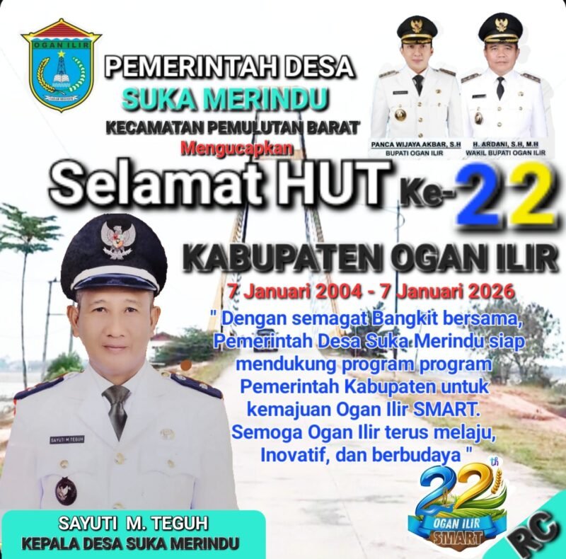 RADARCenter, Ogan Ilir– Pemerintah Desa (Pemdes) Suka Merindu Kecamatan Pemulutan Barat, Kabupaten Ogan Ilir, beserta jajaran dan mewakili seluruh masyarakat Desa Suka Merindu mengucapkan Selamat Hari Ulang Tahun (HUT) ke-22 Kabupaten Ogan Ilir, 7 Januari 2026.