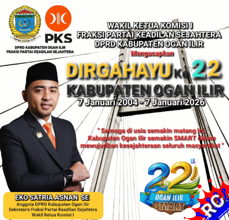 RADARCenter, Ogan Ilir– Eko Satria Asnan, SE anggota Dewan Perwakilan Rakyat Daerah (DPRD) Kabupaten Ogan Ilir, Sekretaris Fraksi Partai Keadilan Sejahtera (PKS) dan juga Wakil Ketua Komisi I mengucapkan Dirgahayu ke-22 Kabupaten Ogan Ilir, 7 Januari 2026.