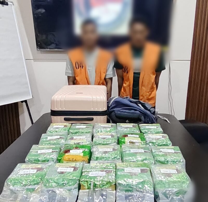 Dari kedua pria itu, ditemukan barang bukti berupa 1 (Satu) Buah Tas Gunung di dalam nya terdapat 10 (Sepuluh) bungkus plastik teh cina berwarna hijau, 1 (Satu) Buah koper Pakaian berwarna pink didalam nya juga terdapat 10 (Sepuluh) bungkus plastik teh cina berwarna hijau dengan berat Total keseluruhan bruto ± 21.142 gram, dan 2 (Dua) Unit HP android merk Oppo berwarna hitam dan Samsung berwarna hijau.