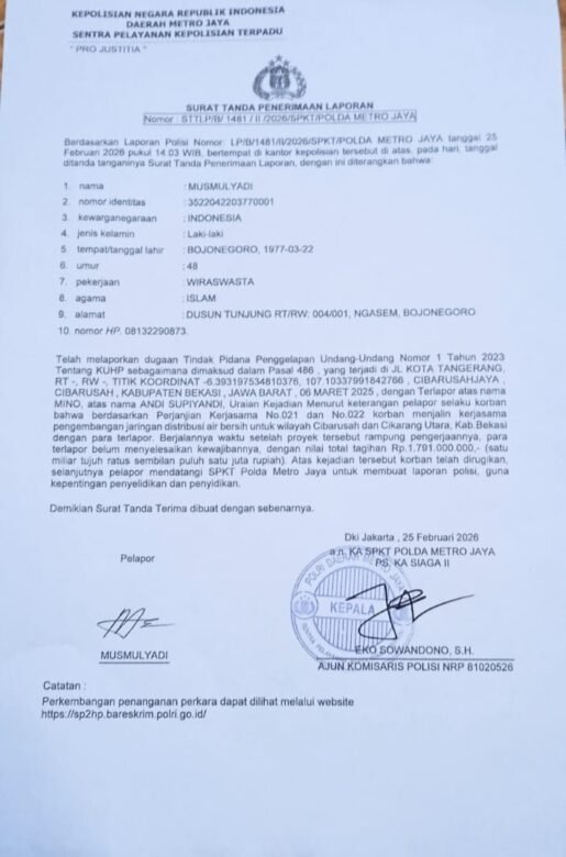 RADARCenter, Bekasi– Mus Mulyadi Subcon PT.Rapa Karya Indonesia dan Tigalapan Adam Internasional resmi telah membuka laporan ke Mapolda Metro Jaya Rabu (25/02/2026), Pelaporan atas Dua perusahaan tersebut, terkait adanya penggelapan anggaran kepada subcon yang tidak di bayarkan sesuai kesepakatan kontrak kerja sama No. 021 untuk PT. RKI lokasi Tanah Merah dan kerjasama No. 022 lokasi Cibarusah.
