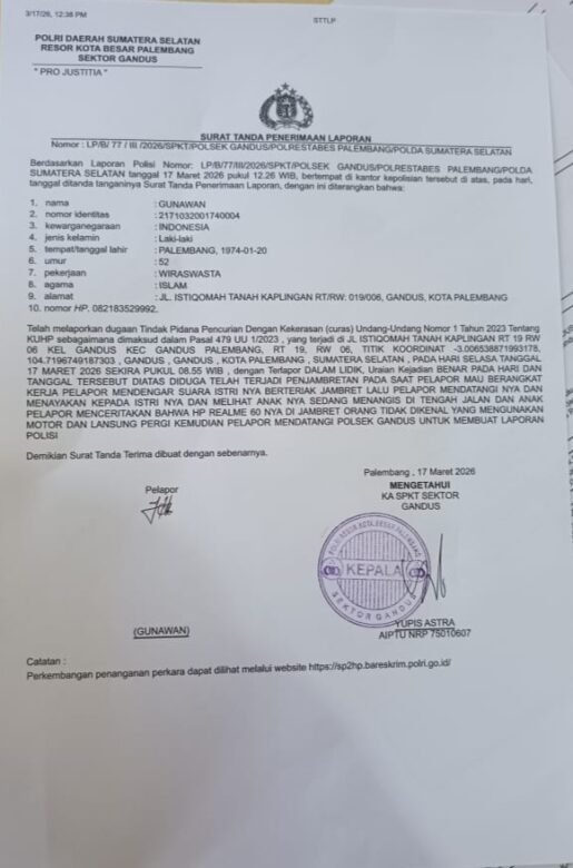 Tidak terima apa yang dialami anaknya, Gunawan orang tua korban langsung lapor ke Polsek Gandus dengan laporan Polisi Nomor : LP/ B/ 77/ 2026/ SPKT/ POLSEK GANDUS/ POLRESTABES PALEMBANG/ POLDA SUMATERA SELATAN tanggal 17 Maret 2026 Pukul 12.26 Wib.