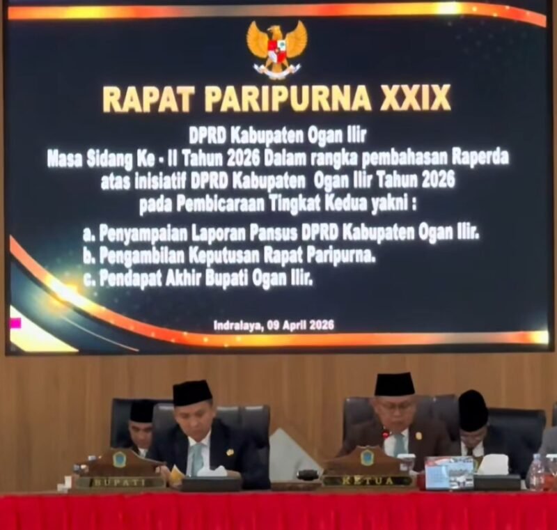 RADARCenter, Ogan Ilir– Dewan Perwakilan Rakyat Daerah (DPRD) Kabupaten Ogan Ilir menggelar Rapat Paripurna XXIX Masa Sidang II Tahun 2026, dalam rangka pembahasan Rancangan Peraturan Daerah (Raperda) atas inisiatif DPRD Kabupaten Ogan Ilir pada pembicaraan tingkat kedua yakni: