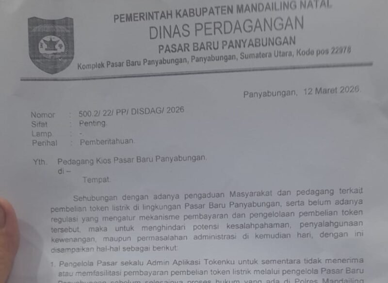 Surat tertanggal 12 Maret 2026, ditandatangani Leli Paridah Nasution selaku pengelola pasar. Dalam isi surat, disampaikan penghentian sementara pembayaran token listrik melalui pengelola karena adanya proses hukum di Polres Mandailing Natal.